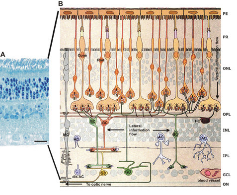 El órgano sensorial de la vía visual se denomina RETINA, y se encuentra alojada en el interior del ojo. Su estimimulación desencadena un impulso nervioso que viaja a través del nervio óptico y del resto de la vía óptica hasta la corteza cerbral occipital, donde va a provocar una respuesta.