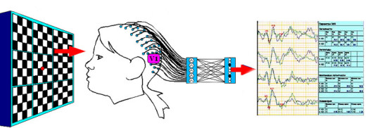 En la corteza occipital, la respuesta cerebral a estos estímulos es recogida mediente unos electrodos colocados sobre el cuero cabelludo y que envían la señal a un procesador digital que la transforma en ondas que pueden ser interpretadas con arreglo a unos datos de normalidad.